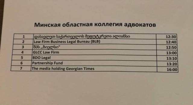 В рамках официального визита Президента Республики Беларусь А.Г.Лукашенко в Грузию Белорусская торгово-промышленная палата пригласила руководителей организаций и предприятий Республики Беларусь совершить деловой визит для принятия участия в работе бизнес-форума с участием Заместителей Премьер-министров двух стран, представителей ряда министерств и ведомств, а также руководителей грузинских организаций и предприятий. В деловом визите приняла участие председатель Минской областной коллегии адвокатов Смирнова Ирина Михайловна. Следует отметить, что делегация Республики Беларусь была представлена руководящими лицами крупнейших предприятий и общественных организаций нашей страны.