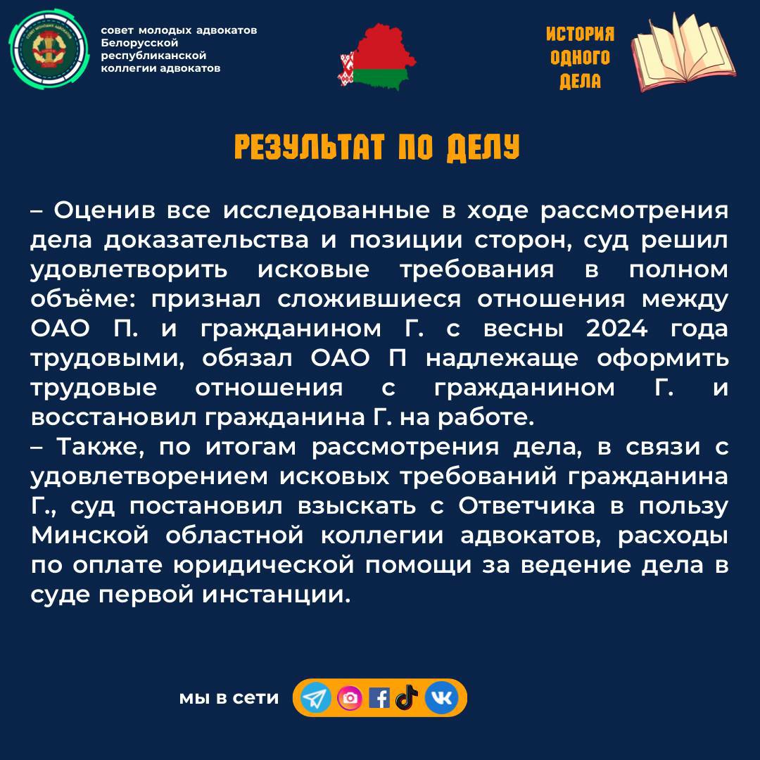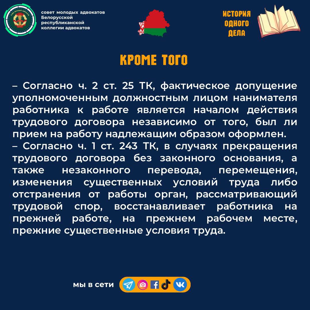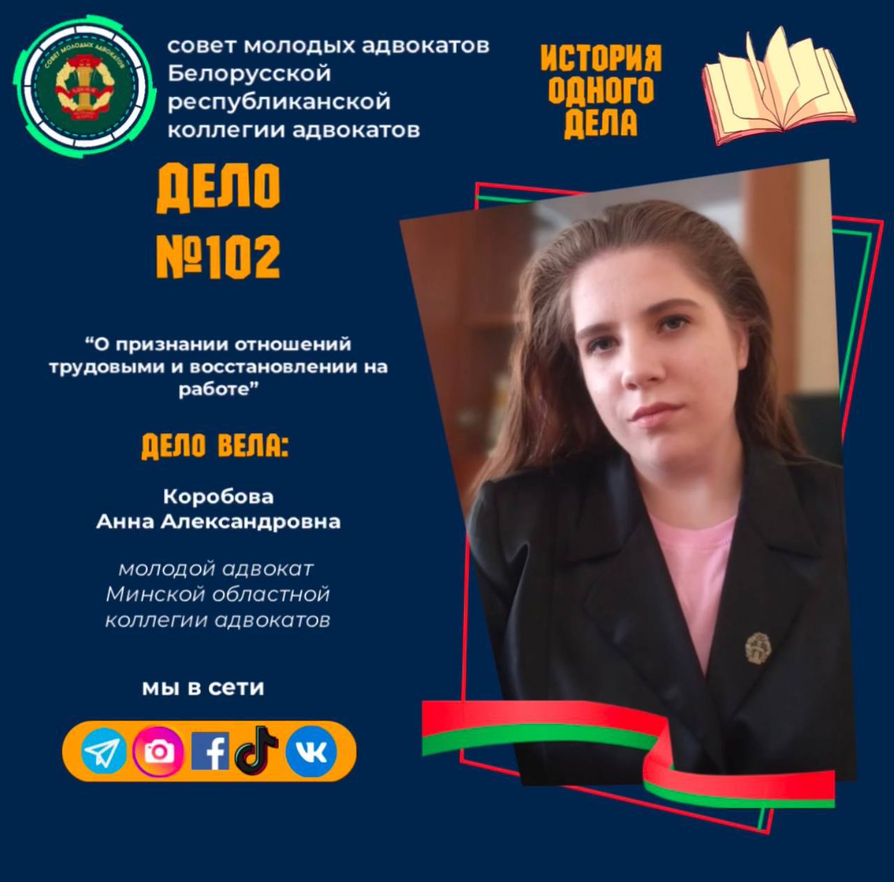 ИСТОРИЯ ОДНОГО ДЕЛА. ДЕЛО № 102: «О признании отношений трудовыми и восстановлении на работе» было в производстве адвоката юридической консультации Смолевичского района Коробовой Анны Александровны.