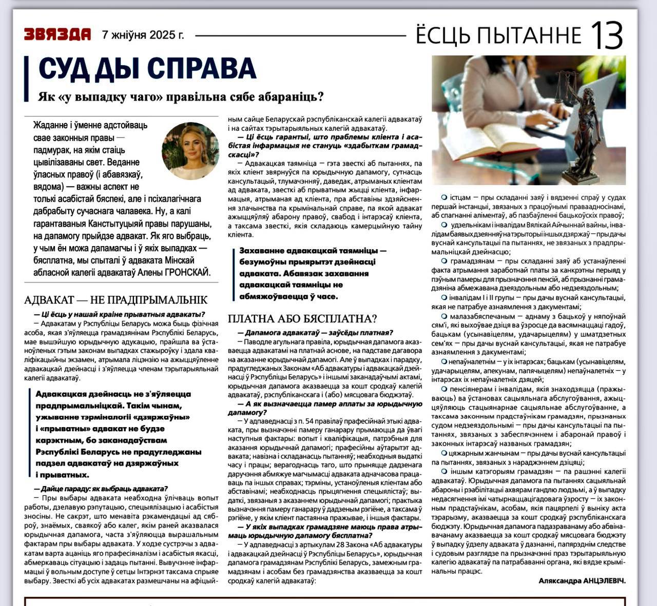 Как его выбрать, в чем он может помочь и в каких случаях — бесплатно, корреспонденту газеты «Звязда» рассказала адвокат Минской областной юридической консультации № 1 Елена ГРОНСКАЯ.